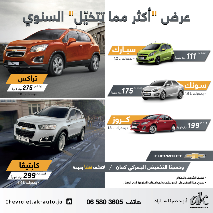 تأتي شيفروليه سبارك المدمجة والإقتصادية بمحرك رياضي جديد 1.2 لتر وتبدأ دفعتها الشهرية من 111 دينار. أما سونك الشبابية تأتي بمحرك 1.6 لتر وتبدأ من 175 دينار شهريا. والسيارة المثالية لأي نمط حياة شفروليه كروز تأتي بمحرك 1.6 لتر وتبدأ من 199 دينار شهريا. أما بالنسبة لسيارة المدينة شفروليه تراكس فتأتي بمحرك 1.8 لتر بدفعة شهرية تبدأ من 275 دينار. وأخيرا شفروليه كابتيفا السيارة العائلية ذات المساحة الكبيرة التي تتسع لسبع ركاب فتأتي بمحرك 2.4 لتر وتبدأ من 299 دينار شهريا.