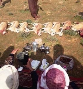 واظهرت مجموعة من الصور المنشورة على مواقع التواصل الاجتماعي الغزلان الميتة والممددة على الارض والسيارات ذي النمر الخليجية، فيما يبدو أنها استعدادا لحفلة شواء.