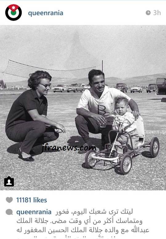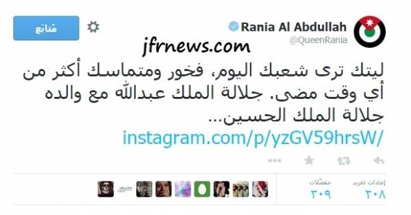 وقالت الملكة رانيا العبد الله في تغريدة لها على مواقع التواصل الإجتماعي : "ليتك ترى شعبك اليوم، فخورا ومتماسكا أكثر من أي وقت مضى. جلالة الملك عبدالله مع والده جلالة الملك الحسين"