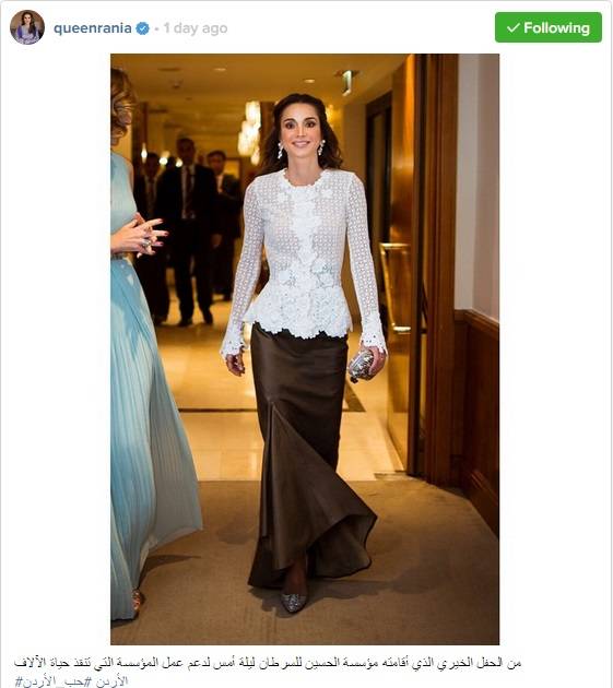 الصورة التي حصلنا عليها من صفحتها الرسمية على أنستغرام queenrania@ أظهرت لنا جانباً آخر من أناقة الملكة، فهي تحتفظ بملابسها لتعيد ارتداءها وتنسيقها بطريقة جديدة.