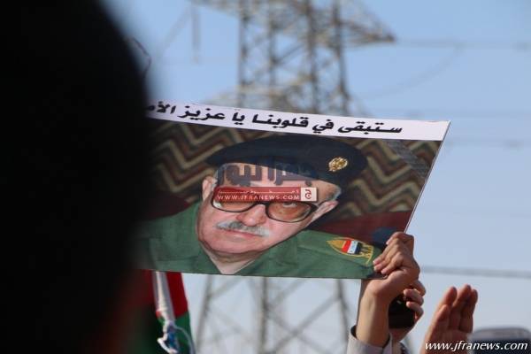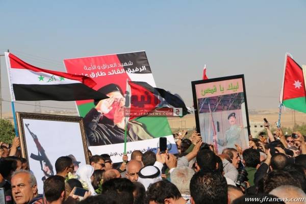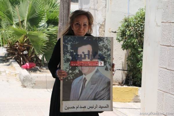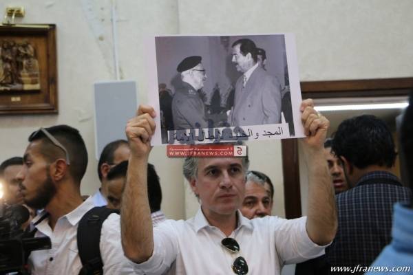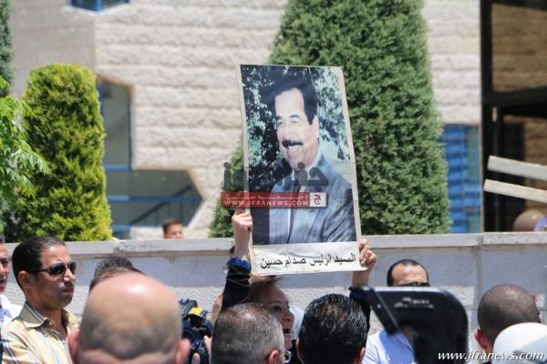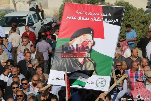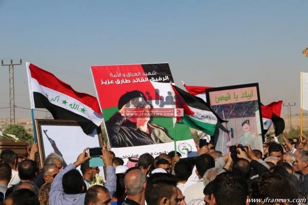 ولدى إنزال التابوت من سيارة الإسعاف، جرى رفع صور عزيز إلى جانب صور الرئيس العراقي الراحل صدام حسين، من قبل الحضور.