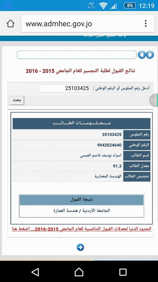 اسراء نتيجة اجتهادها وتفوقها وابداعها وموهبتها في هذا التخصص الذي يحتاج الى الابداع والموهبة الى جانب الاجتهاد لتحصيل مثل هذا المعدل تمكنت من الحصول على مقعد ضمن قائمة التجسير في الجامعة الاردنية في تخصص هندسة العمارة ومثل الحصول على هذا المقعد في الجامعة الام الذي هو حلم كل طالب من المفروض ان يبث الفرح في نفسها ويرسم البسمة على وجوه افراد اسرتها الا ان الحزن والوجوم حل على اسراء وعلى افراد اسرتها .