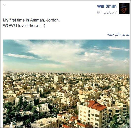 وبينما اكتفى سميث بنشر صورة لعمّان عبر صفحته على فيسبوك، معلقا عليها "زيارتي الأولى لعمّان.. أحب المكان هنا"، نشر جيبسون صورة تجمعه بسميث معلقا عليها إنها في حفل زفاف بالأردن.