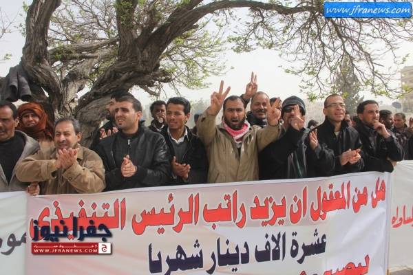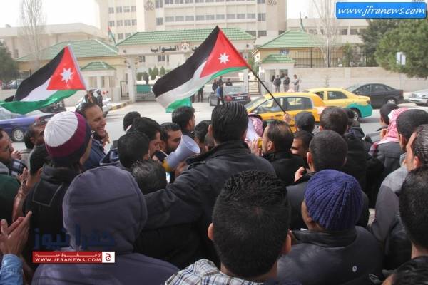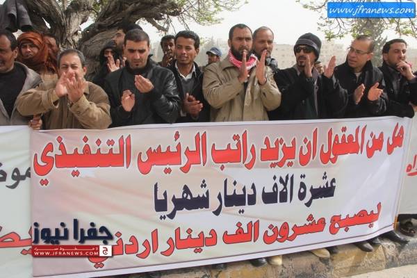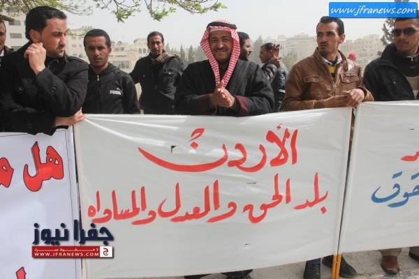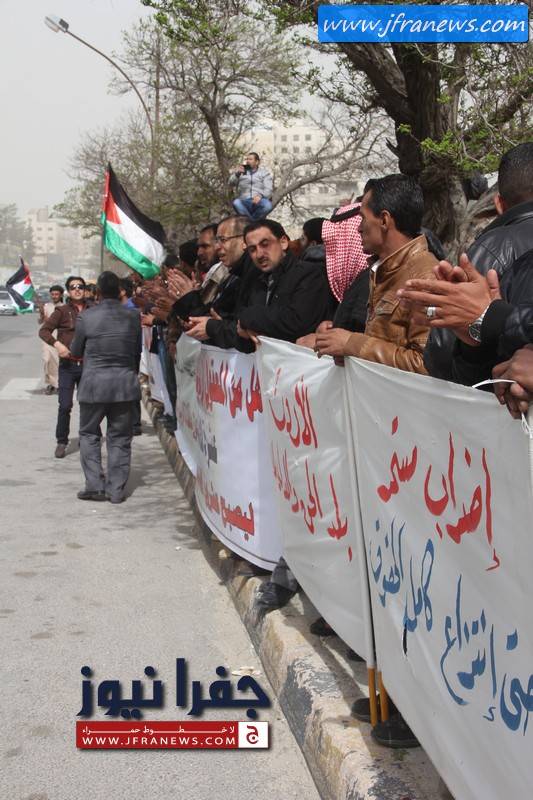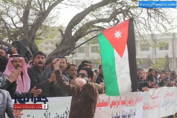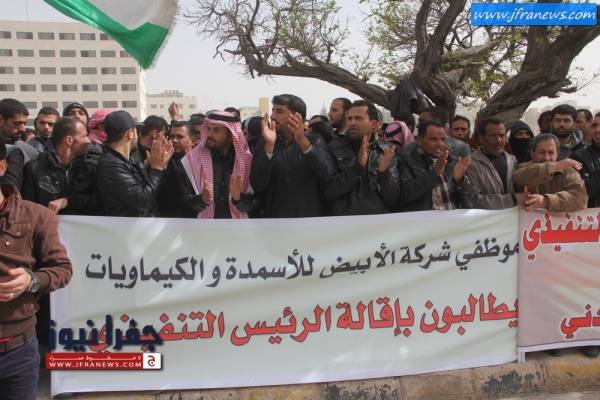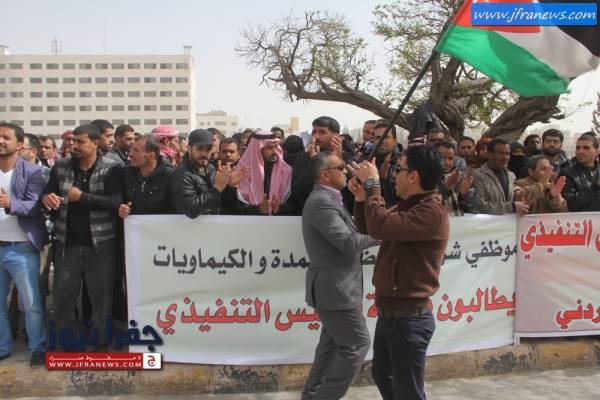 ورفع العمال يافطات استنكرت رفع راتب الرئيس التنفيذي للشركة من 10 الاف الى 20 الف دينار شهري في ظل خسائر الشركة المتراكمة.