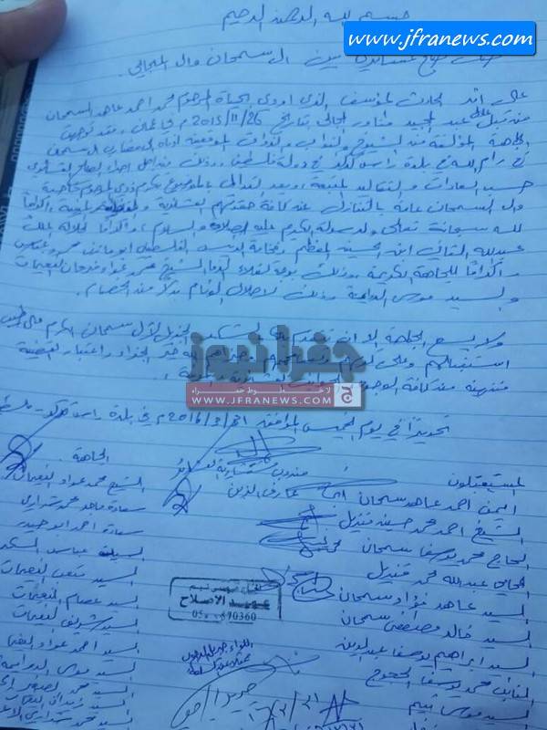 جفرا نيوز تنشر وثيقة الصلح العشائري بين عشيرتي المجالي وسمحان .. صور