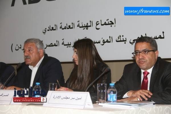 جفرا نيوز- عقدت الهيئة العامة لشركة بنك المؤسسة العربية المصرفية (الأردن) اجتماعها السنوي العادي السادس والعشرون وذلك يوم الاثنين الموافق 25/4/2016 برئاسة سعادة السيد صائل الوعري رئيس مجلس الإدارة، وحضور السادة أعضاء مجلس الإدارة، والسيدة سيمونا سابيلا بشوتي المدير العام للبنك، ومندوب مراقب عام الشركات، ومدققي الحسابات السادة ارنست ويونغ، ومندوب البنك المركزي الأردني، وحضور مساهمين يملكون ما نسبته (%90,701) من رأس مال البنك.