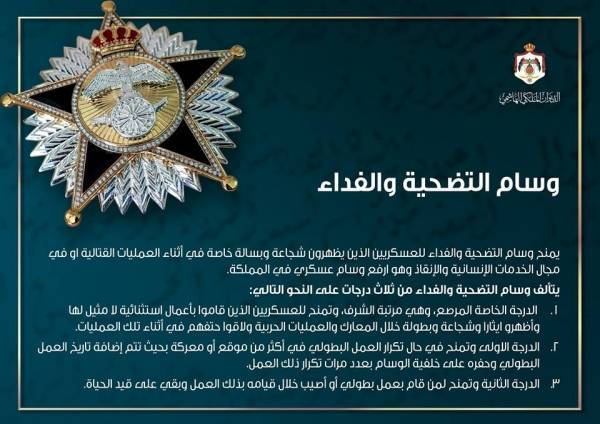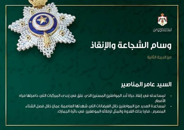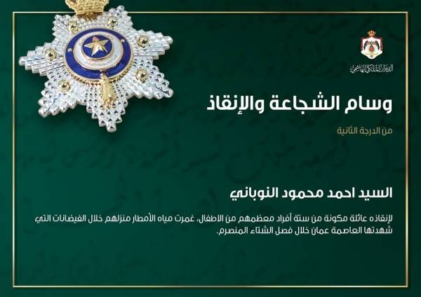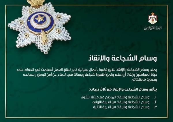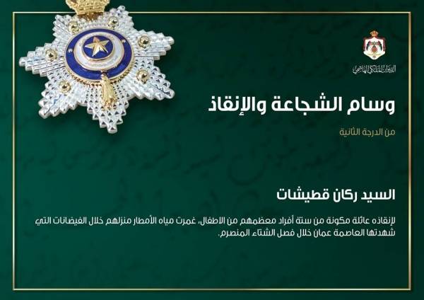 وأنعم جلالة الملك بوسام الشجاعة والانقاذ من الدرجة الثانية على كل من ركان قطيشات، وأحمد النوباني، وعامر المناصير، تقديرا لما قدموه من صورة مشرقة للمواطنة الصالحة والشجاعة والإيثار، حيث سجلوا أروع الأمثلة في البطولة والاقدام وهم يلبون نداء الواجب الإنساني، وخاطروا بحياتهم لإنقاذ أسر وأفراد حاصرتهم مياه الأمطار، خلال موسم الشتاء المنصرم، بكل تفان وروح معطاءة أصيلة.