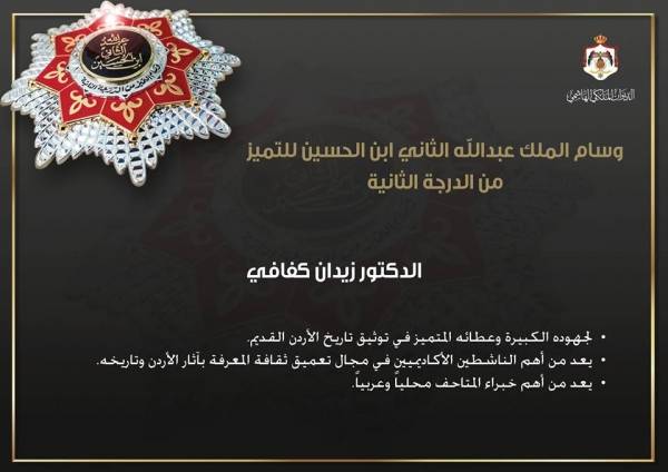 كما أنعم جلالته على الدكتور زيدان عبدالكافي كفافي بوسام الملك عبدالله الثاني ابن الحسين للتميز من الدرجة الثانية، تقديرا لجهوده الكبيرة وعطائه المتميز في توثيق تاريخ الأردن القديم، ودوره في تعميق ثقافة المعرفة بآثار الأردن وتاريخه.