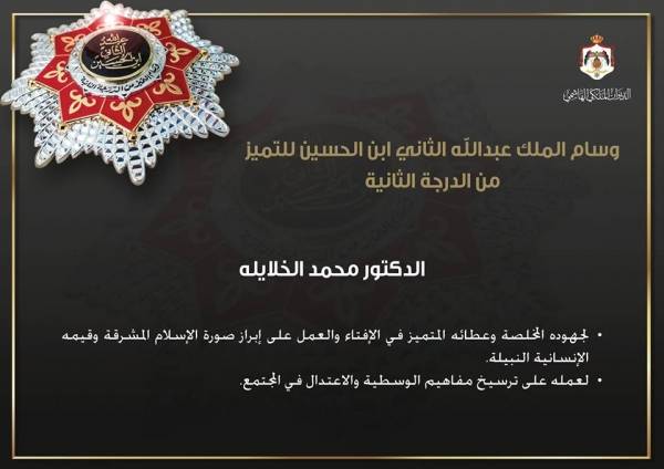 وأنعم جلالته على الدكتور محمد أحمد الخلايلة بوسام الملك عبدالله الثاني ابن الحسين للتميز من الدرجة الثانية، تقديراً لجهوده المخلصة وعطائه المتميز وخدماته الجليلة في الإفتاء وإبراز صورة الإسلام المشرقة وقيمه الإنسانية النبيلة.