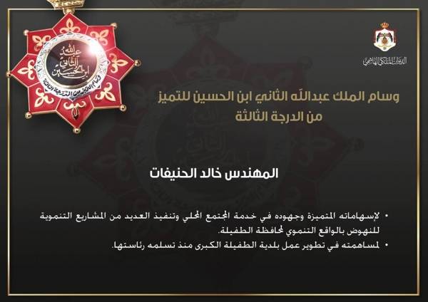 كما أنعم جلالته على المهندس خالد موسى الحنيفات بوسام الملك عبدالله الثاني ابن الحسين للتميز من الدرجة الثالثة، وذلك تقديراً لجهوده الدؤوبة في خدمة المجتمع المحلي وتنفيذ العديد من المشاريع التنموية للنهوض بالواقع التنموي لمحافظة الطفيلة.