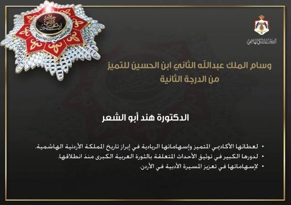 وأنعم جلالته على الدكتورة هند أبو الشعر بوسام الملك عبدالله الثاني ابن الحسين للتميز من الدرجة الثانية، تقديراً لعطائها الأكاديمي المتميز وإسهاماتها الريادية في إبراز تاريخ المملكة الأردنية الهاشمية، ودورها الكبير في توثيق الأحداث المتعلقة بالثورة العربية الكبرى منذ انطلاقها.