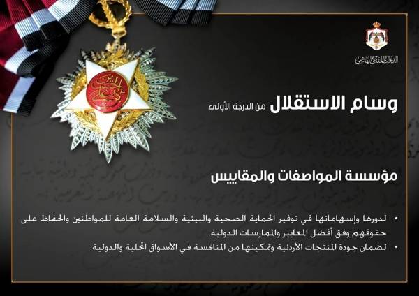 كما أنعم جلالته على مؤسسة المواصفات والمقاييس بوسام الاستقلال من الدرجة الأولى، تسلمه مديرها العام الدكتور حيدر الزبن، تقديراً لدورها وجهدها الدؤوب وإسهاماتها المتميزة في توفير الحماية الصحية والبيئية والسلامة العامة للمواطنين وفق أفضل المعايير والممارسات الدولية، وكذلك ضمان جودة المنتجات الأردنية وتمكينها من المنافسة في الأسواق المحلية والدولية.