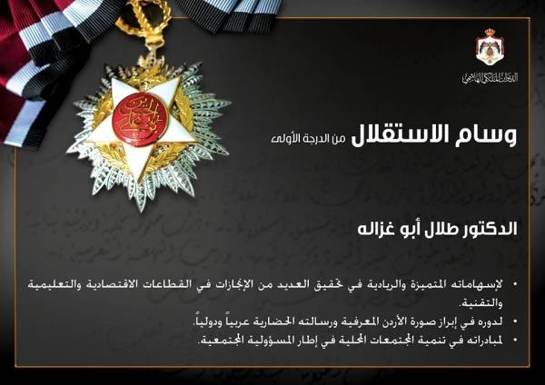 كما أنعم جلالته على الدكتور طلال أبو غزالة بوسام الاستقلال من الدرجة الأولى، وذلك تقديراً لإسهاماته المتميزة والريادية في تحقيق العديد من الإنجازات في القطاعات الاقتصادية والتعليمية والتقنية، ودوره في إبراز صورة الأردن المعرفية ورسالته الحضارية عربياً ودولياً، فضلاً عن مبادراته في تنمية المجتمعات المحلية في إطار المسؤولية المجتمعية.