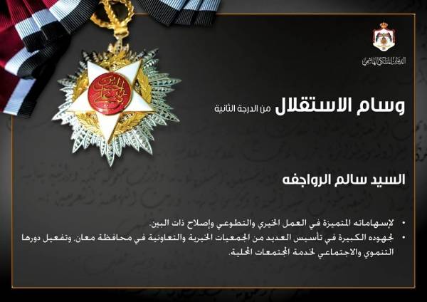 كما أنعم جلالته على السيد سالم علي الرواجفة بوسام الاستقلال من الدرجة الثانية، تقديراً لإسهاماته المتميزة في العمل الخيري والتطوعي وإصلاح ذات البين، وكذلك لجهوده الكبيرة في تأسيس العديد من الجمعيات الخيرية والتعاونية في محافظة معان.