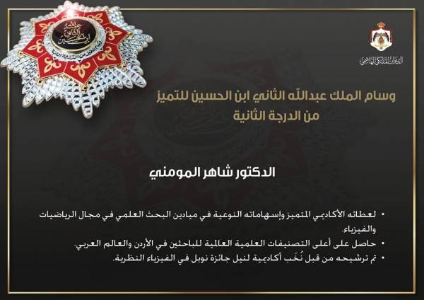 كما أنعم جلالته على الدكتور شاهر محمد أحمد المومني، بوسام الملك عبدالله الثاني ابن الحسين من الدرجة الثانية، تقديراً لعطائه الأكاديمي المتميز وإسهاماته النوعية في ميادين البحث العلمي في مجال الرياضيات والفيزياء. ولترشيحه من قبل نُخَب أكاديمية لنيل جائزة نوبل في الفيزياء النظرية.
