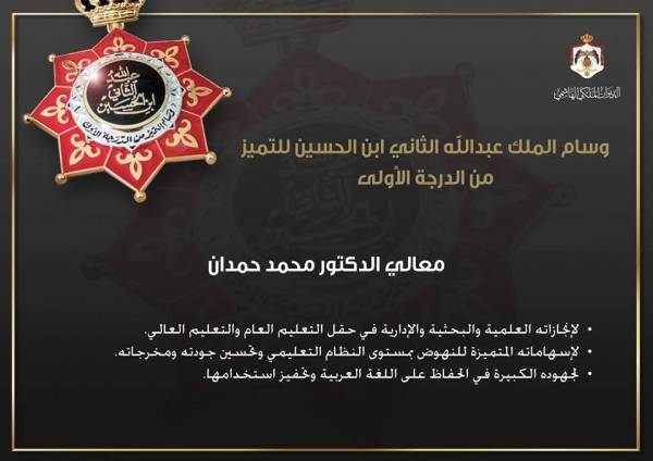 وأنعم جلالته على الدكتور محمد حمدان بوسام الملك عبدالله الثاني ابن الحسين للتميز من الدرجة الأولى، تقديراً لإنجازاته العلمية والبحثية والإدارية في حقل التعليم العام والتعليم العالي، وإسهاماته المتميزة للنهوض بمستوى النظام التعليمي وتحسين جودته ومخرجاته.