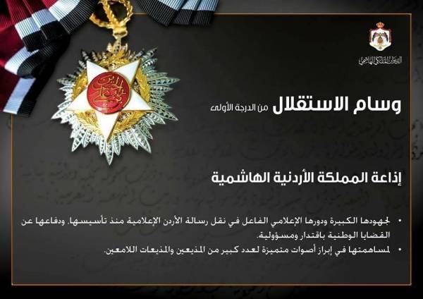 وأنعم جلالته بوسام الاستقلال من الدرجة الأولى على إذاعة المملكة الأردنية الهاشمية، تسلمه مدير عام مؤسسة الإذاعة والتلفزيون محمد الطراونة، تقديراً لجهودها الكبيرة ودورها الإعلامي الفاعل في نقل رسالة الأردن الإعلامية، والدفاع عن القضايا الوطنية بكل اقتدار وشفافية ومسؤولية عالية، منذ تأسيسها قبل سبعة وخمسين عاما.