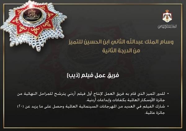 وأنعم جلالته على فريق عمل فيلم"ذيب"، بوسام الملك عبدالله الثاني ابن الحسين للتميز من الدرجة الثانية، وتسلمه عن فريق العمل: بطل الفيلم جاسر الصويلحيين، ومخرج الفيلم ناجي أبو نوار، ومنتجه باسل غندور، تقديراً للدور المميز الذي قام به فريق العمل لإنتاج أول فيلم أردني يترشح لجائزة الأوسكار العالمية لعام 2016، وتم تنفيذه بكفاءات وإبداعات أردنية طموحة، وحصل على ما يزيد عن (20) جائزة عالمية.