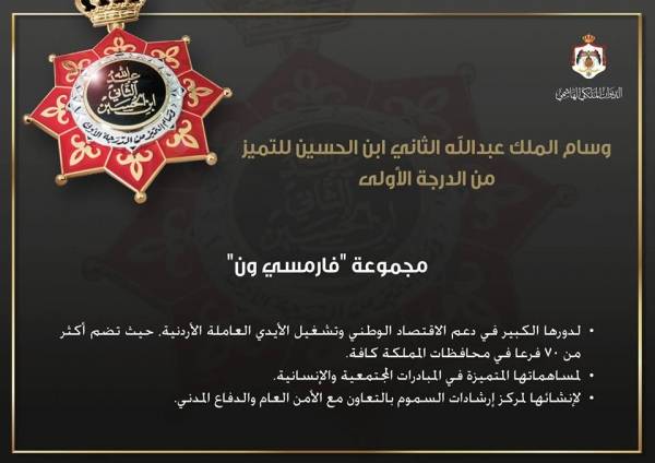كما أنعم جلالته بوسام الملك عبدالله الثاني ابن الحسين للتميز من الدرجة الأولى على مجموعة "فارمسي ون"، تسلمه الدكتور أمجد العريان، تقديراً لدورها الكبير في دعم الاقتصاد الوطني وتشغيل الأيدي العاملة الأردنية، ومساهماتها المتميزة في المبادرات المجتمعية والإنسانية.