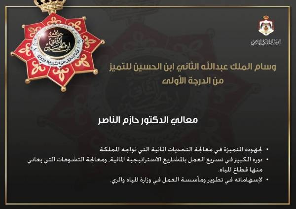 فقد أنعم جلالته على وزير المياه والري، الدكتور حازم الناصر، بوسام الملك عبدالله الثاني ابن الحسين للتميز من الدرجة الأولى، تقديراً لجهوده المتميزة في معالجة التحديات المائية التي تواجه المملكة، ودوره الكبير في تسريع العمل بالمشاريع الاستراتيجية المائية الوطنية.