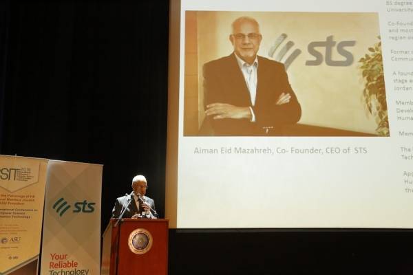 كما قدم المهندس أيمن مزاهرة الشريك المؤسس والرئيس التنفيذي لشركة STSالرائدة في تقديم حلول تكنولوجيا المعلومات في المملكة والمنطقة عضو اللجنة الوطنية لتطوير الموارد البشرية في المملكة محاضرة عن احتياجات سوق العمل في مجال تكنولوجيا الملعلومات واهمية ان يتحلى خريج كلية تكنولوجيا المعلومات بالمهارات التي تؤهله ليكون جاهزاً لسوق العمل وبين السيد مزاهرة بأن التكنولوجيا دخلت حياتنا بشكل كامل بحيث اصبحنا نعيش بعصر التحول الرقمي، الامر الذي يدعوا الى تدريس البرمجة في المدارس نظرا لأهميتها الكبيرة في الوقت الحاضر. واضاف بأن المحتوى العربي على شبكة الانترنت يعاني من ضعف وشح كبيرين ولا يتجاوز المحتوى العربي 2% من بين المحتوى