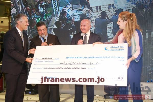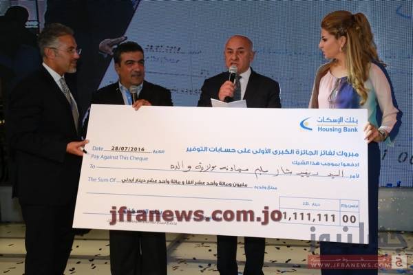 فاز الطفل ديفيد بشار سليم السهاونة باكبر جائزة في الاردن، والبالغة مليون و111 الف و111 دينار، والمقدمة من بنك الاسكان للعملاء الذي يملكون حساب توفير.