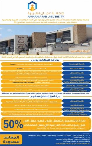 جفرا نيوز - أعلنت جامعة عمان العربية عن استحداث كلية الهندسة وتشمل الهندسة المدنية والعمارة، واستحداث كلية الصيدلة وفتح باب القبول والتسجيل فيهما اعتباراً من الفصل الدراسي الأول من العام الجامعي 2016/2017، ويستمر التسجيل في كافة التخصصات المطروحة في الجامعة لدرجتي البكالوريوس والماجستير لغاية 15/10/2016.
