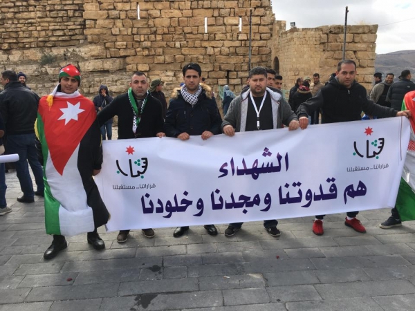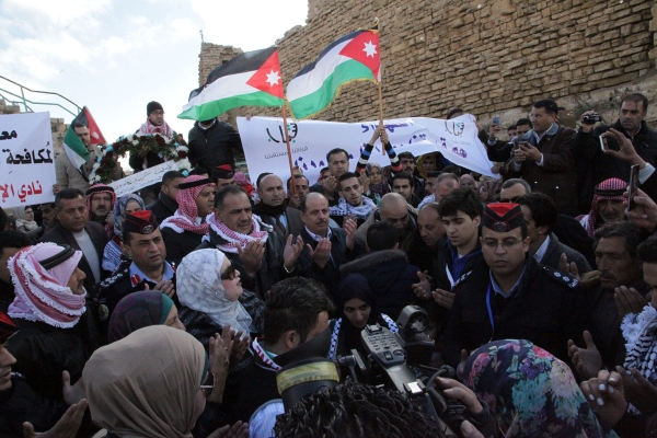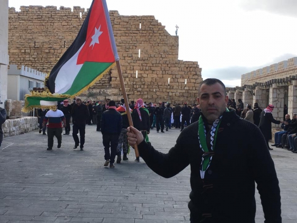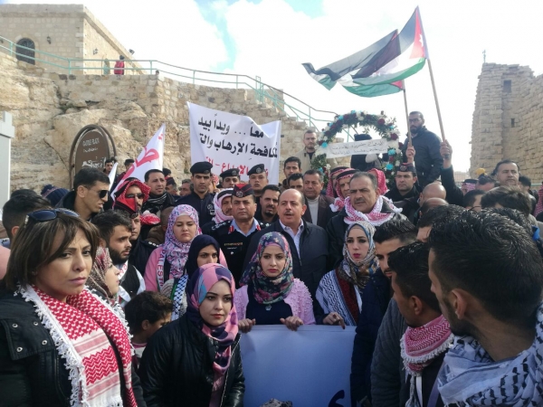 نظمت الفعاليات الشبابية والشعبية من مختلف أنحاء المملكة وقفة تضامنية، الأحد، أمام قلعة الكرك جنوبي الأردن مؤكدة وقوفها إلى جانب أسر الشهداء والأجهزة الأمنية والتزامها بمحاربة الإرهاب والتطرف.