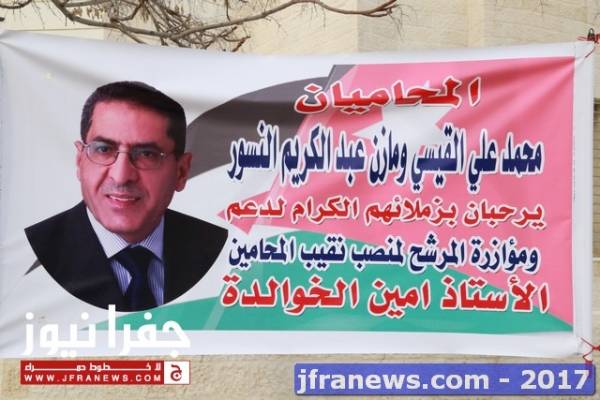 واحتشد المئات من المحامين مساء اليوم السبت في جمعية الريحان غرب عمان ، واعربوا عن دعمهم ومؤازرتهم للخوالدة الذي يخوض غمار الانتخابات المزمع عقدها الشهر القادم.