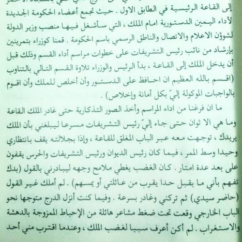 ويتابع العدوان في كتابه الذي صدر مؤخرا: عندما تجمع اعضاء الحكومة الجديدة لاداء اليمين الدستورية أمام الملك التي سأشغل فيها منصب وزير الدولة لشؤون الاعلام والاتصال والناطق الرسمي باسم الحكومة ، قمنا كوزراء بتمرينين بارشاد من نائب رئيس التشريفات على خطوات مراسم اداء القسم ، وذلك قبل أن يدخل الملك الى القاعة ، بدأ الرئيس والوزراء تلاوة القسم التالي بالتناوب " اقسم بالله العظيم أن احافظ على الدستور وان اخلص للملك وان اقوم بالواجبات الموكولة الي بكل امانة واخلاص "