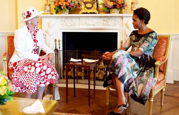 الطريف أن جدول أعمال السيدة الأولى كان يشمل ظهر اليوم نفسه مقابلة مع الملكة مارجريت ملكة الدنمارك في المكتب البيضاوي في البيت الأبيض، حيث ظهرت أوباما بحذاء بكعب مرتفع، وقرط أنيق، لتوضح كيف يمكن أن تظهر بأشكال مختلفة، حتى وهي ترتدي الفستان نفسه.