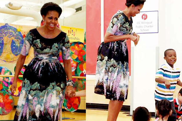وارتدت أوباما الفستان ذا الأرضية السوداء والورود الملونة بألوان مختلفة، منها الأخضر، في يناير/كانون الثاني عام 2009 للمرة الأولى، أثناء زيارتها دار حضانة في واشنطن، ضمن مشاركتها في حملة توعية بأهمية الرياضة والحركة.