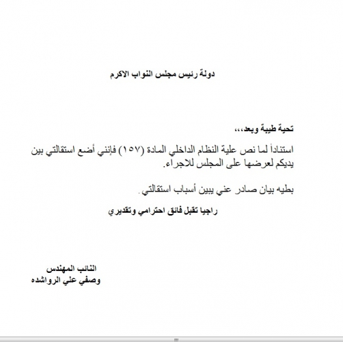 انقر على الصورة لقراءة نص استقالة النائب وصفي الرواشدة
