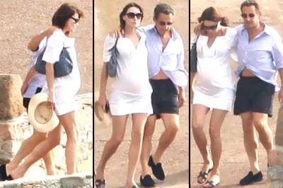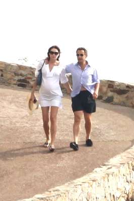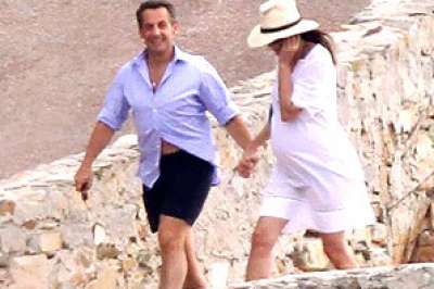 وظهر الرئيس الفرنسي ساركوزي (56 عاما) مرتديا قميصا مخططا مفتوحا وسروالا قصيرا أزرق اللون وهو يحيط زوجته بذراعه في لحظات عاطفية، كما وصفتها صحيفة الديلي ميل البريطانية، فيما ظهرت بروني (43 عاما) في الصورة، مرتدية ثوبا أبيض قصيرا.