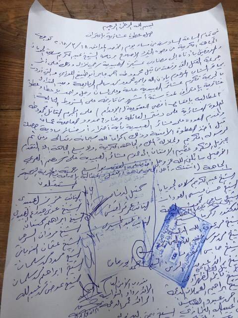 حيث تكرمت عشيرة العبيدية عامة بإخطار عشيرة الاللوزي مدة ستة اشهر من تاريخه على الشروط التالية : المطالبة بإيقاع اقصى العقوبة (الاعدام) على المجرم القاتل محمود طه و جلوة عشائرية على دفتر العائلة و خارج حدود العاصمة عمان وعدم العودة على عشائر العبيدية بأية اضرار أو خسائر مادية حصلت قبل اخذ العطوة الانية وذلك اكراماً لوجه الله تعالى ورسوله و الملك عبد الله الثاني .