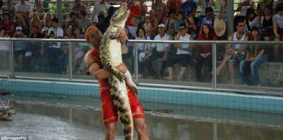 وعادة ما تقضم التماسيح عصى من الخيزران بصوت عالٍ أو تعض عليها، ثم تتم استثارتها قبل أن يضع الرجال رؤوسهم في أفواهها ويبقونها هناك لفترة طويلة، وتضم الحديقة أكثر من 10 آلاف تمساح.