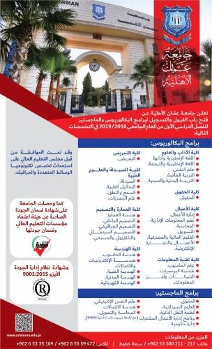 جفرا نيوز - تعلن جامعة عمان الاهلية عن فتح باب القبول والتسجيل لبرامج البكالوريوس والماجستير للفصل الدراسي الاول من العام الجامعي 2018-2019 في جميع التخصصات (التفاصيل بالاعلان المرفق )