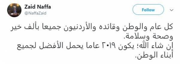 وغرّد نفاع على موقعه بمنصة تويتر بمناسبة العام الجديد قائلا :"كل عام والوطن وقائده والأردنيون جميعا بألف خير وصحة وسلامة ، إن شاء الله؛ يكون ٢٠١٩ عاما يحمل الأفضل لجميع أبناء الوطن "