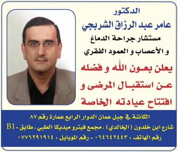 جفرا نيوز - الدكتور عامر عبد الرزاق الشربجي - مستشار جراحة الدماغ و الأعصاب و العمود الفقري