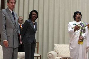 نراه في إحدى الصور مثلا وهو واقف منشرح وسعيد وكوندوليزا الى جانبه خجولة بعض الشيء، ونراه في صورة ثانية وهو جالس مستكين يتأمل فيها، بينما لا تدري هي أي مشاعر كانت تختلج في نفسه أثناء لقائها به في 5 أيلول/سبتمبر 2008 ببيته في طرابلس الغرب، وكانت أول زيارة يقوم بها وزير خارجية أمريكي منذ 1953 الى ليبيا.