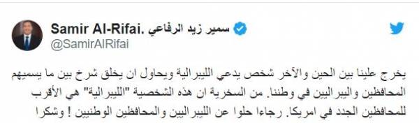 وجاء كلام الرفاعي في تغريدة على مواقع التواصل الاجتماعي تويتر حيث انتقد خروج شخصيات اعتبرها تدعي الليبرالية الا انها تحاول خلق شرخ بين المحافظين والليبراليين في الاردن.