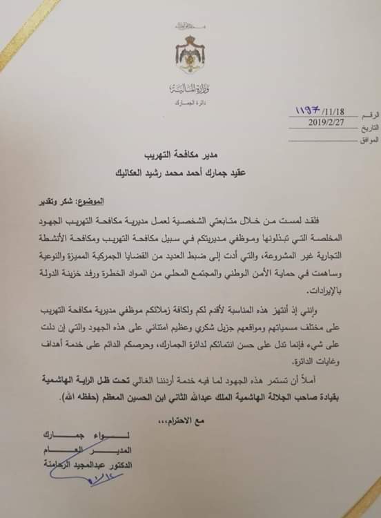 جفرا نيوز - جفرا نيوز - وجه مدير عام الجمارك اللواء جمارك د.عبدالمجيد الرحامنة كتاب شكر لمدير مكافحة التهريب العقيد جمارك احمد العكاليك نظير الجهود الكبيرة التي تبذلها مديرية مكافحة التهريب والتي ادت لضبط العديد من القضايا الجمركية المميزة والنوعية التي ساهمت في حماية الامن الوطني والمجتمع المحلي من المواد الخطرة ورفد خزينة الدولة .