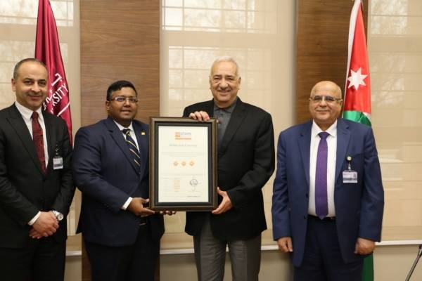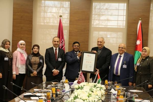 وتسلمت الجامعة شهادة التصنيف من المدير الإقليمي للمؤسسة السيد "أشون فرناندز" خلال حفل حضره رئيس مجلس أمناء الجامعة الدكتور يعقوب ناصرالدين،ونائب رئيس الجامعة الأستاذ الدكتور محمود الوادي ومساعدي الرئيس، والأساتذة عمداء الكليات ، ومساعديهم لشؤون الجودة، وكادر عمادة الاعتماد والجودة والمعلومات، وعمادة البرامج الدولية .