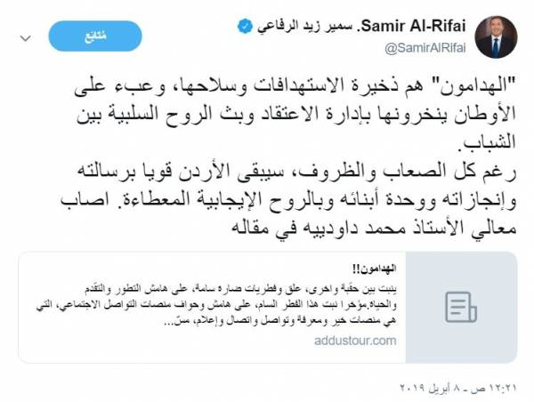 جفرا نيوز - قال رئيس الوزراء الاسبق سمير الرفاعي ،اليوم الثلاثاء في تغريدة على حسابه على موقع التويتر،ان "الهدامون" هم ذخيرة الاستهدافات وسلاحها، وعبء على الأوطان ينخرونها بإدارة الاعتقاد وبث الروح السلبية بين الشباب.