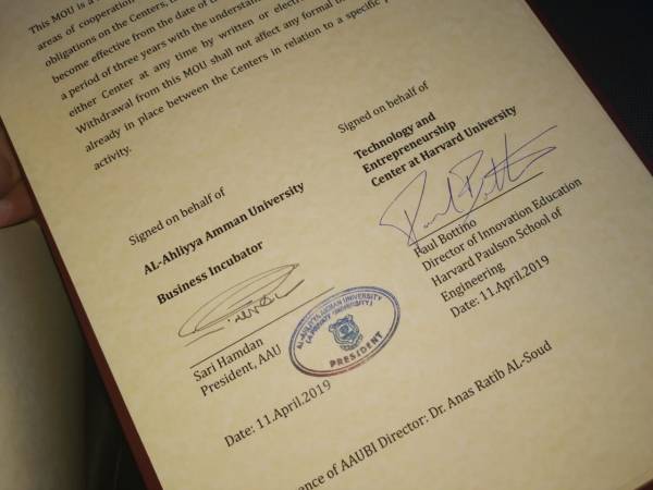 وتعد هذه الإتفاقية هي الاولى من نوعها في الشرق الأوسط، وقد وقع الإتفاقية عن جامعة عمان الأهلية الأستاذ الدكتور ساري حمدان رئيس الجامعة وعن جامعة هارفارد الأستاذ الدكتور بول بوتينو مدير TECH في جامعة هارفارد، وحضر توقيع الإتفاقية الأستاذ الدكتور فوز هابل عميد كلية الهندسة والعلوم التطبيقية في جامعة هارفارد والدكتور أنس السعود مدير الإعتماد والتصنيف الدولي ومدير حاضنة الأعمال في جامعة عمان الأهلية.
