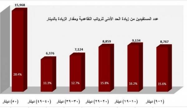 جفرا نيوز - جفرا نيوز - أوضح الناطق الرسمي باسم المؤسسة العامة للضمان الاجتماعي موسى الصبيحي بأن المستفيدين من قرار رفع الحد الأدنى الأساسي لراتب التقاعد وراتب الاعتلال هم المتقاعدون من مختلف أنواع الرواتب التقاعدية وتشمل الشيخوخة والمبكر والعجز الإصابي والعجز الطبيعي والوفاة الطبيعية والإصابية الذين تقل رواتبهم التقاعدية الأساسية عن (100) دينار وعددهم (56228) متقاعداً من ضمنهم (33) ألف متقاعد على قيد الحياة، و (23) ألف أسرة متقاعد متوفّى، حيث تراوحت قيمة الزيادة على الراتب الأساسي لكل من هؤلاء ما بين (1 – 50) ديناراً، وفقاً للرسم الموضح، مضيفاً بأن متوسط الزيادة هو (28) ديناراً.