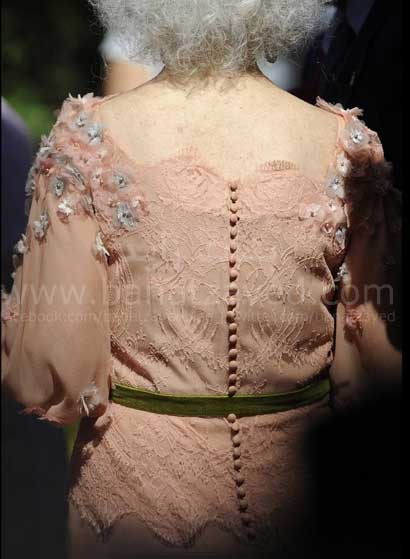 وظهرت الدوقة في الحفل ببدلة زفاف ذات لون وردي فاتح موشاة بلون اخضر لتقوم برمي باقة الورود على حشد الحاضرين كما رقصت الفلامنكو.