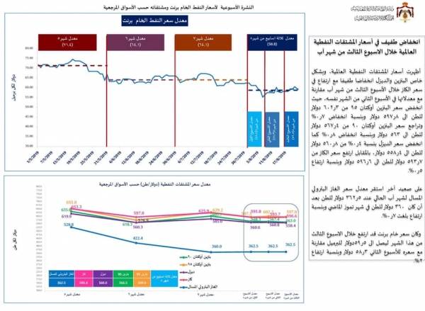 جفرا نيوز - كشفت وزارة الطاقة صباح الاثنين، عن النشرة الأسبوعية لأسعار النفط الخام برنت ومشتقاته حسب الأسواق المرجعية للإسبوع الثالث من شهر آب 2019.