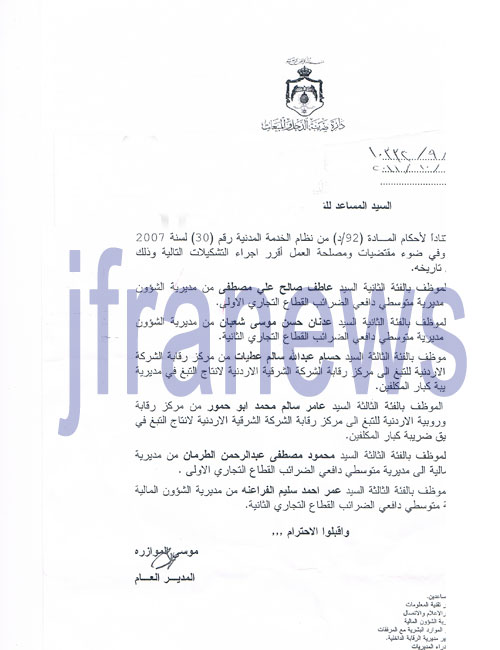 بلاغ نضعه امام الجهات المختصة بمحاربة الفساد وتتعلق بالمحاباة والمحسوبية التي يمارسها مدير عام ضربية الدخل والمبيعات موسى الموازرة الذي قام وخلال 3 شهور بنقل الموظف بالفئة الرابعة عامر سالم محمد ابو حمور الى ثلاثة مديريات هامة تتضمن امتيازات متعددة واخرها نقله الى مركز رقابة الشركة الشرقية لانتاج التبغ في مديرية تدقيق ضريبة كبار المكلفين