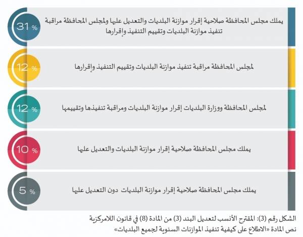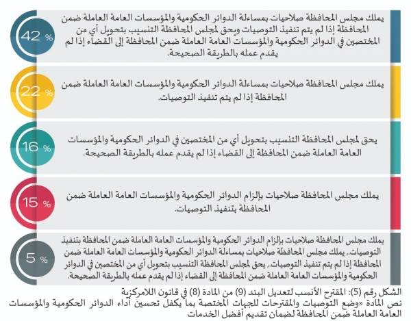 وطالب ما نسبته 80 بالمئة من المستجيبين بوجود مقر مستقل لمجالس المحافظات، وان 62 بالمئة أيدوا تشكيل مجالس المحافظات من خلال الانتخاب المباشر وغير المباشر بشرط أن يكون عدد الأعضاء المنتخبين مباشرةً أكبر من الأعضاء الذي يتم اختيارهم من خلال الانتخاب غير المباشر.